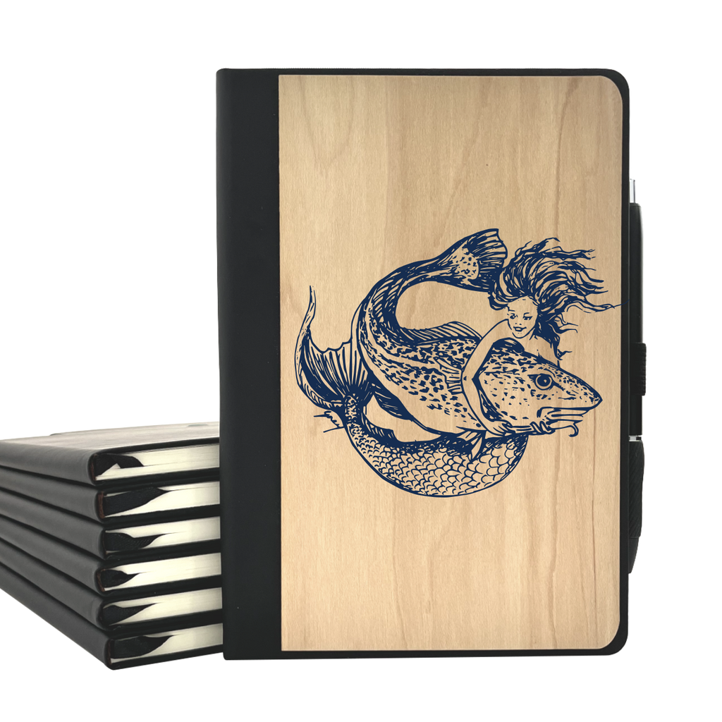 Expertly etched wooden cover journal with pen included. Includes elastic place finder band.
